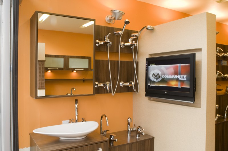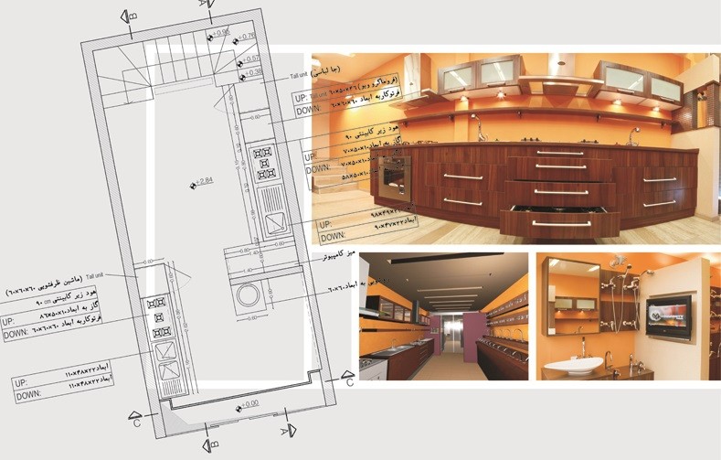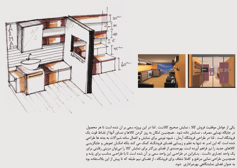 یکی از عوامل موفقیت فروش کالا ، نمایش صحیح کالاست. لذا در این پروژه سعی بر آن شده است تا هر محصول در جایگاه نهایی مصرف،نمایش داده شود . همچنین امکان به روز کردن کالاها و نمای آنها از نقاط قوت یک فروشگاه است .لذا در طراحی فروشگاه آرمان ، شیوه نوینی برای نمایش و اتصال ساده شیرآلات به بدنه ها طراحی شده است که این امر نه تنها به نظم و زیبایی فضای فروشگاه کمک می کند بلکه امکان تعویض و جایگزینی کالاهای جدید را نیز فراهم آورده است .بهره مندی از فضای بزرگتر برای نمایش کالا را می توان مزیتی رقابتی برای یک واحد تجاری دانست . بنابراین در طراحی این واحد سعی برآن شده است تا با طراحی مناسب برای پله و همچنین طراحی نمایی مرتفع و کاملا شفاف برای فروشگاه ، از فضای نیم طبقه که تاپیش از این بلا استفاده بود به عنوان فضای نمایشگاهی بهره برداری شود .